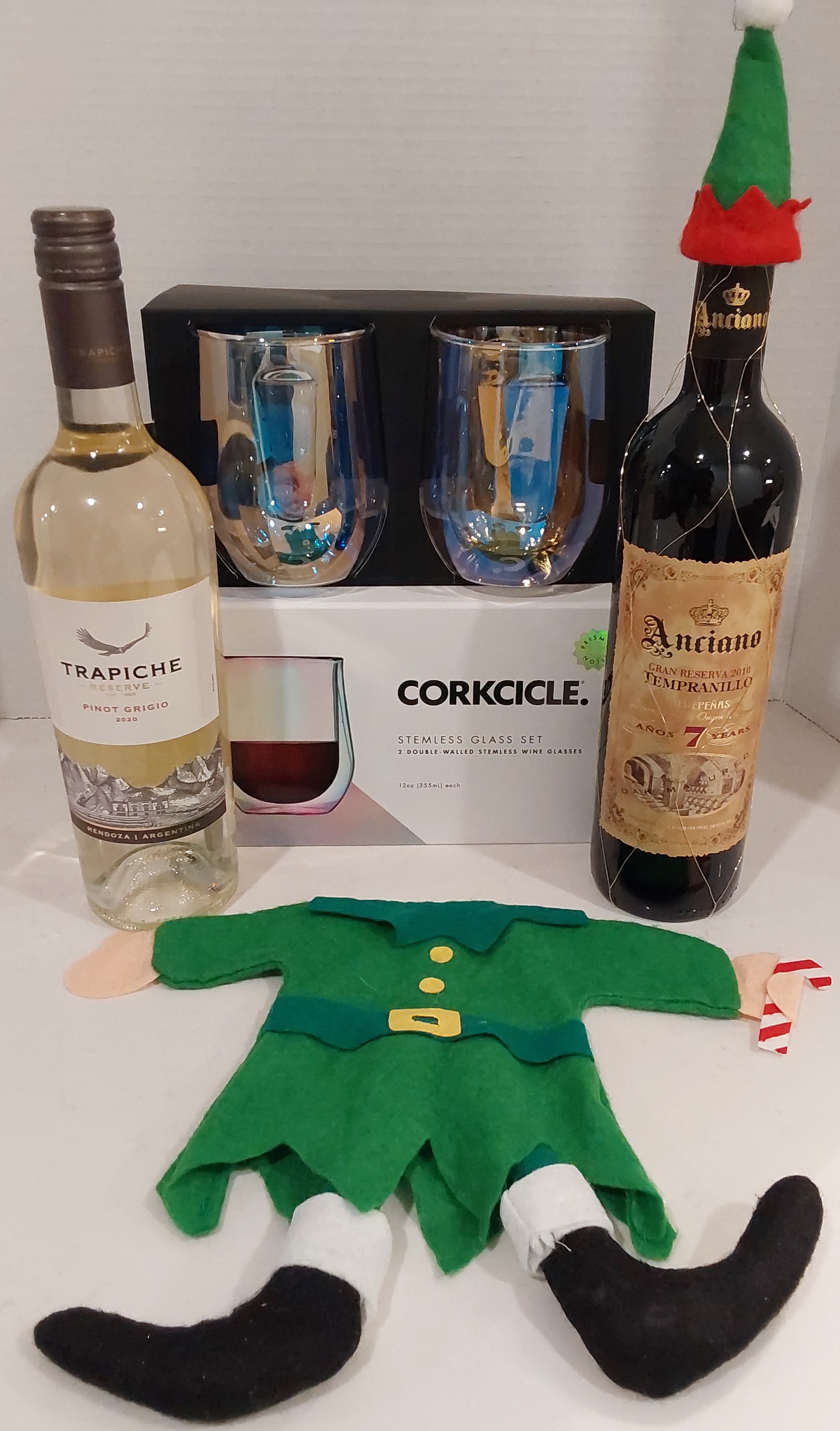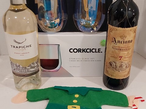 A great gift for yourself and or someone you know. This pack includes a set of Corkcicle Stemless glasses, 1 bottle of Trapiche Reserve Pinot Grigio (White, Argentina) and1 bottle of Anciano Tempranillo 7 years (Red, Spain).