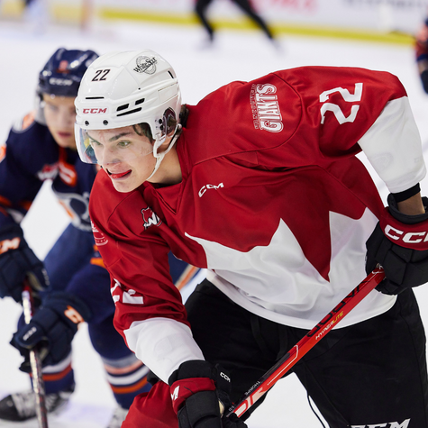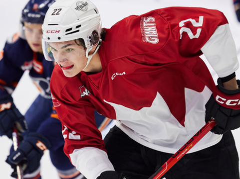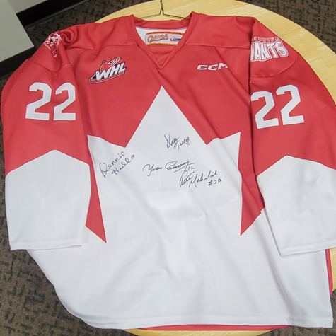 Sublimated replica jersey from the 1972 Canada-Russia Summit Series, worn during the Giants' Novermebr 18, 2022 Legends Night game. Signed by Dennis Hull, Pete Mahovlich, Yvan Cournoyer, and Dale Tallon.