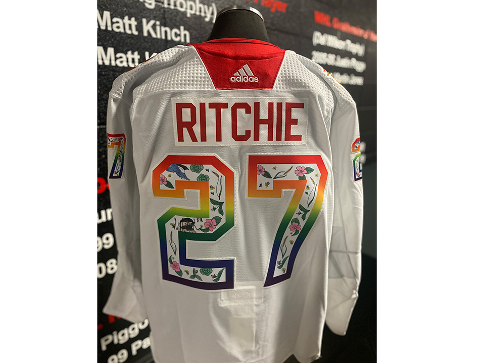 The autographed Pride Night Warm Up jerseys are authentic on-ice jerseys engineered by ADIDAS to the exact specifications of the National Hockey League. The jersey is made in Canada and the material is 100% polyester. The jersey features an authentic tie down strap and player name and number on the back and sleeves. The logos and pattern inside the numbers were designed by a local artist from the LGBTQ2+ community. The pattern inside the Flames logo and player numbers has incorporated flora and fauna from the Alberta prairies and foothills, as well as some queer-coded florals (green carnations, lilacs...) and arranged them all in a soft and inviting pattern, loosely based on the same colour pattern as the pride flag (with the white, pink, blue, brown and black chevron).