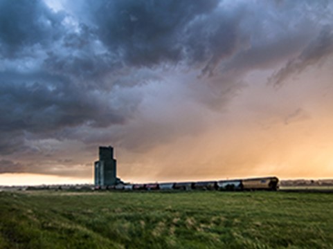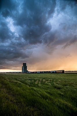 Rural landscape that feels like home - "Storm clouds over Niobe" by Patrick Teskey Photography. This is a 24x16 on canvas showcasing a rural grain elevator with sunset skies taken in Red Deer County. Make this breath taking view a part of your collection today.