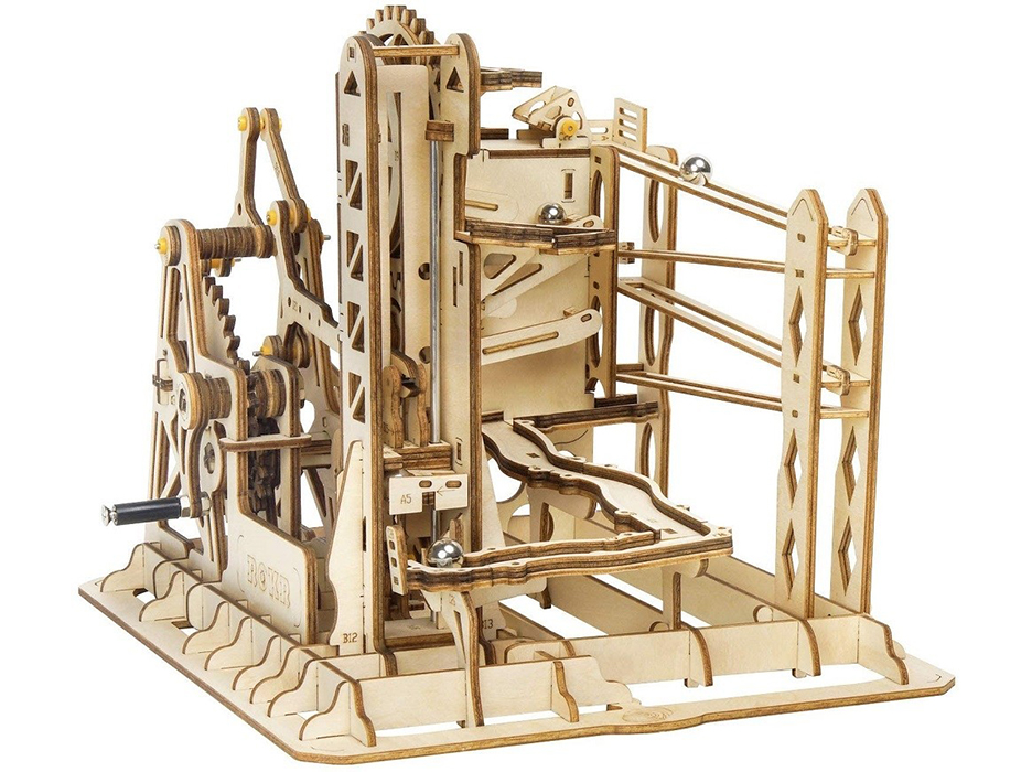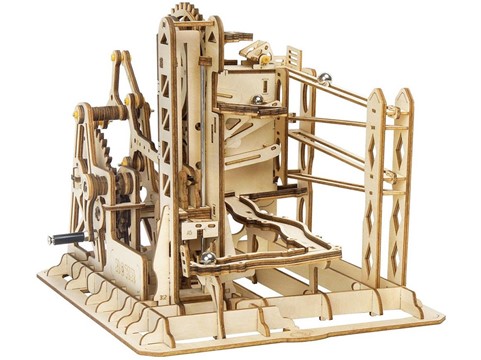 Challenge your mind with this amazing wooden puzzle. Build a working marble climber.