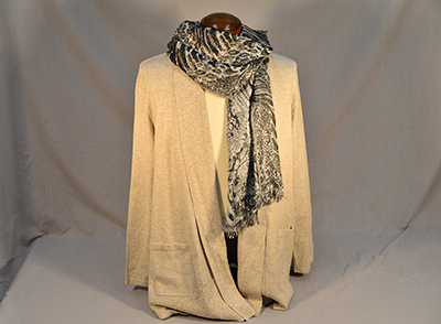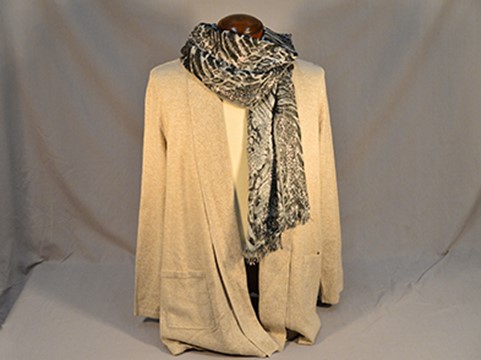 Get cozy with this oatmeal coloured Alia cardigan size XL and pair it with the fall TanJay scarf in a metallic animal print. This ensamble will have you stylish and cozy for all the holiday markets and festive events in your future.