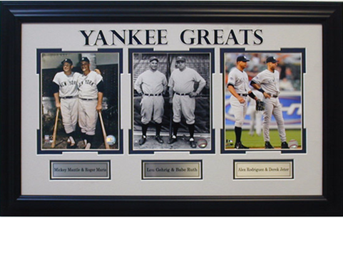 Three timeless photos of New York Yankees legends like Ruth, Gehrig, Mantle, Jeter and more are featured in this brand new collectible. "Yankees Greats" is displayed in laser cut text across the top. Size 34" x 22".