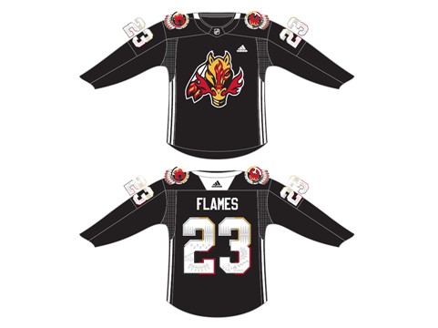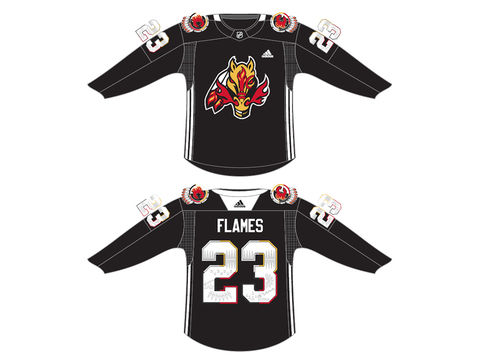 The autographed Indigenous Celebration Night practice jerseys are authentic on-ice jerseys engineered by ADIDAS to the exact specifications of the National Hockey League. The jersey is made in Canada and the material is 100% polyester. The jersey features an authentic tie down strap and player name and number on the back and sleeves. The logos and pattern inside the numbers were designed by a local Indigenous artist. The logo tells the story of the Indigenous community in Treaty 7 Territory, the blasty logo is used to honour tradition, the organization and it’s loyal fanbase. He has a circle around his eye for keen vision, and stripes added to symbolize great achievements. The eagle feather often represents the culture and our connection to history. Indigenous communities use them to honour great achievements or in this case milestones. The talks of reconciliation also coincide with change, therefore the ¬flames in the tips of the feathers are used to represent that “spark” of change in a forward moving direction. The overall design is intended to be representative of the people and to share that connection and history of their relationship with the land. This jersey is exclusive to this auction only and are not available for purchase through any other outlet.