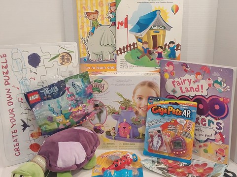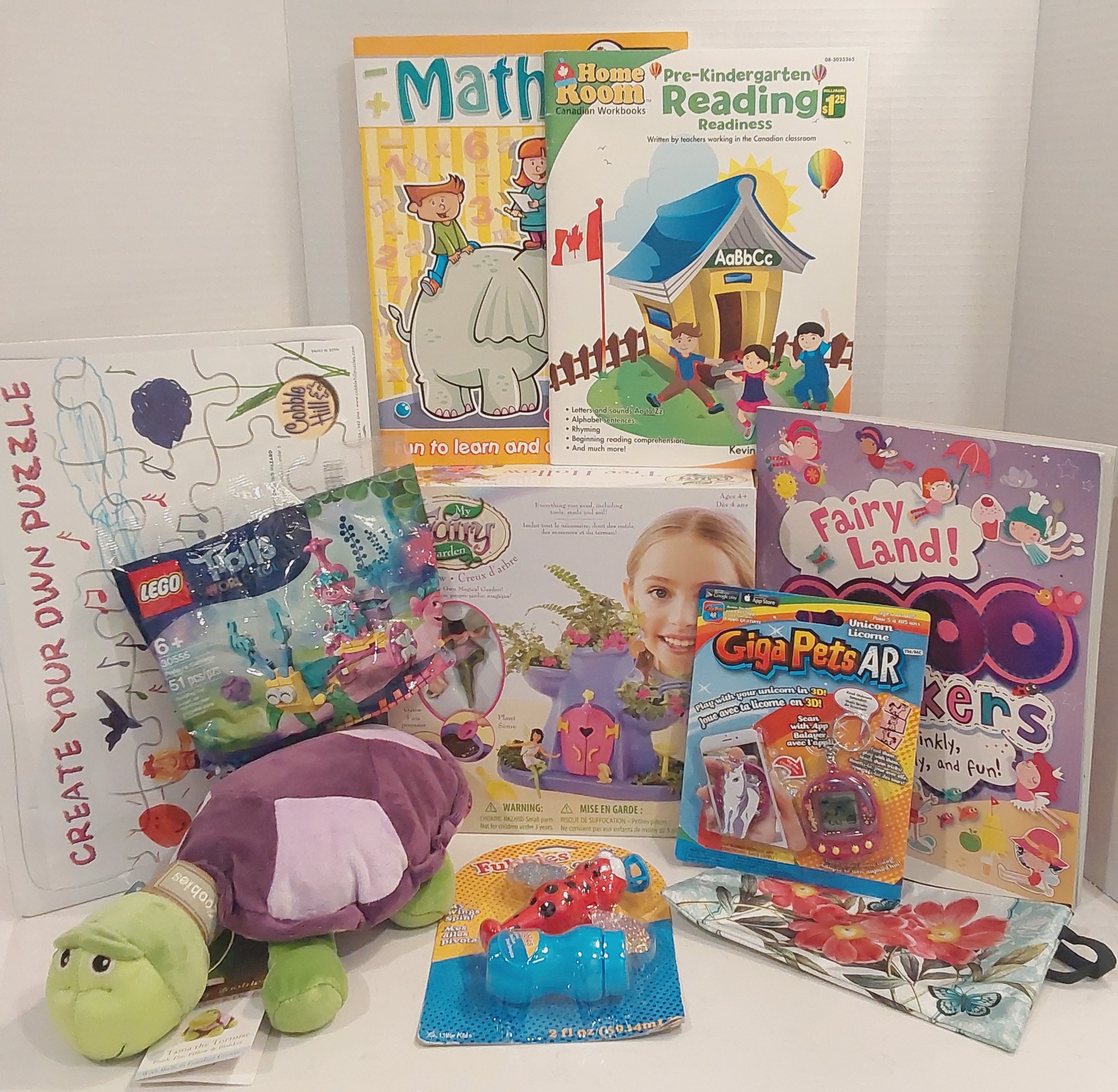 This cute basket includes a fairy garden tree hollow, a fairy land sticker book, Kindergarten learning books, Trolls lego, a Unicorn Giga Pet, a create your own puzzle, bubble glitter bug, and a 3-in-1 plush turtle toy.