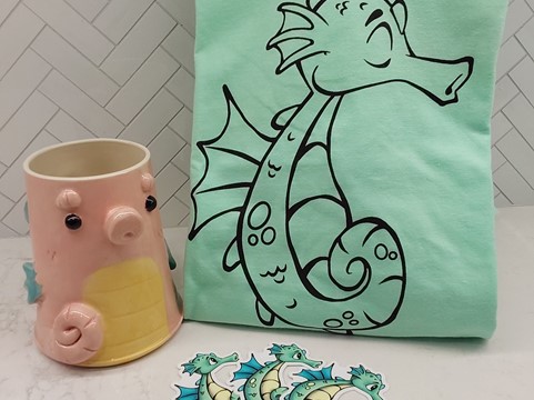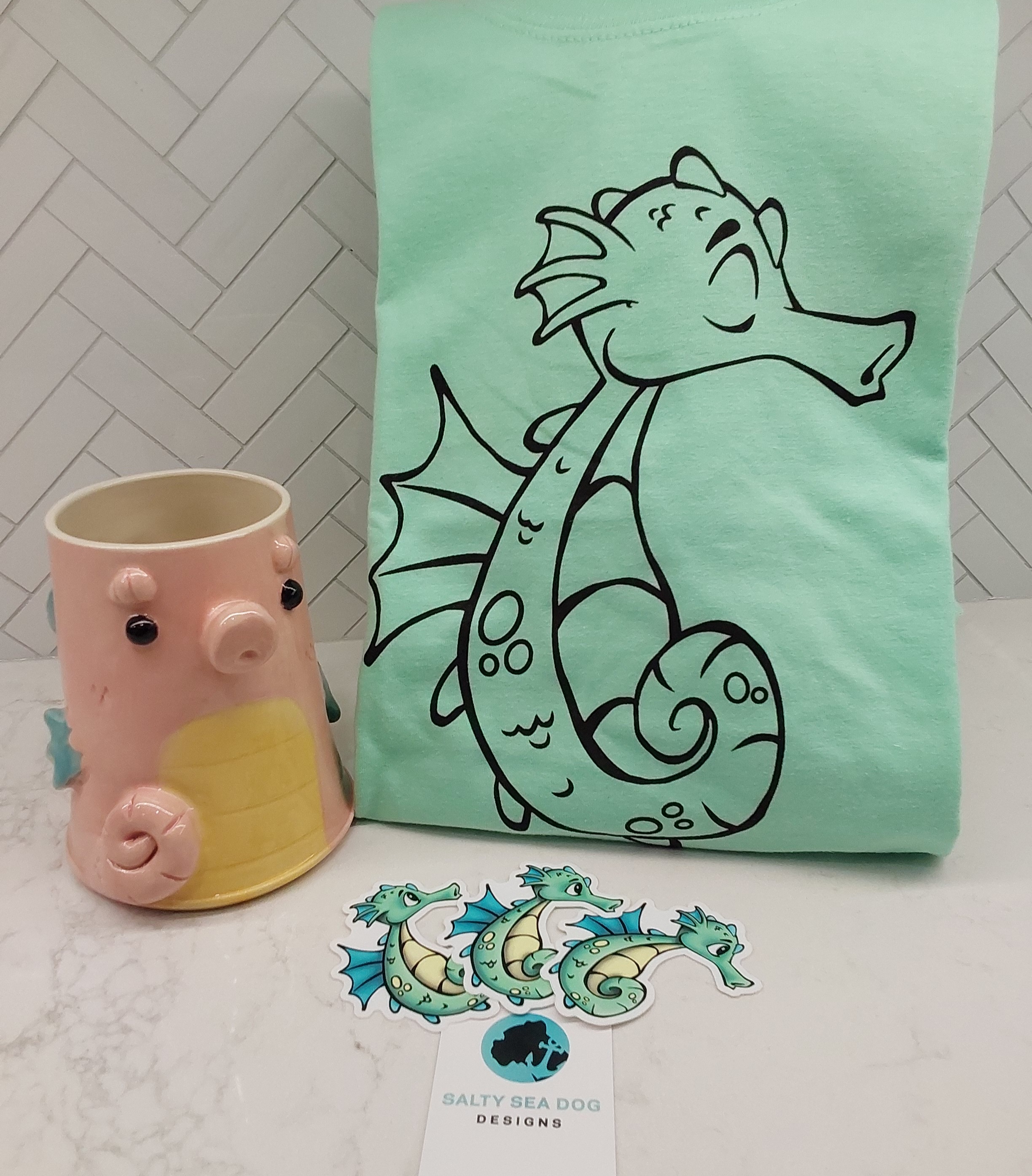 If you have a love for the sea and supporting local artists this basket is for you! This adorable Seahorse mug is a hand made high quality pottery mug. This mug is microwave and dishwasher safe. Also included is a unisex size small Seahorse t-shirt with 3 Seahorse stickers. Salty Sea Dog Designs is the collaboration between the husband and wife duo of Blair and Sarah Dawes. Their ceramic partnership explores animal designs with cheerful colours, animated expressions and whimsical creations. To see more of their creations follow them on facebook or instagram @saltyseadogdesigns.