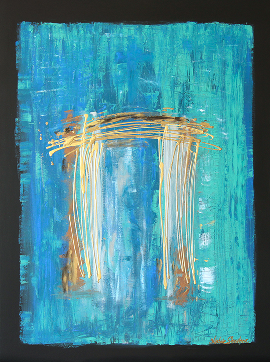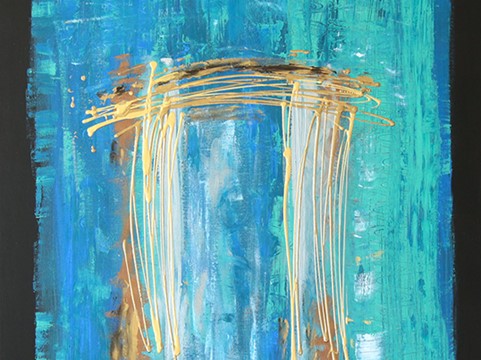 Inspired by architecture. The design of the bridge can represent so many things for different people. Ultimately to me when I cross the bridge, I always see peace on the other side. My purpose in painting and creating this is to stimulate the brain to sense the calmness of the color blue and the concept of the bridge to center oneself with the union of one another while creating universal peace. When one can stand in the center of peace, that energy expands from one point to the next and onward. This painting is symbolic and in-depth in many ways, whichever way you perceive it to be. The place of inner peace is the utmost place of serenity in every aspect of ones being, in the middle of chaos of life, one can find a deeper meaning of life which is to love unconditionally yourself and others. No matter what the circumstances the only thing real in this short time we have on earth is L O V E. Acrylic on canvas 30" x 40" x 1.5"