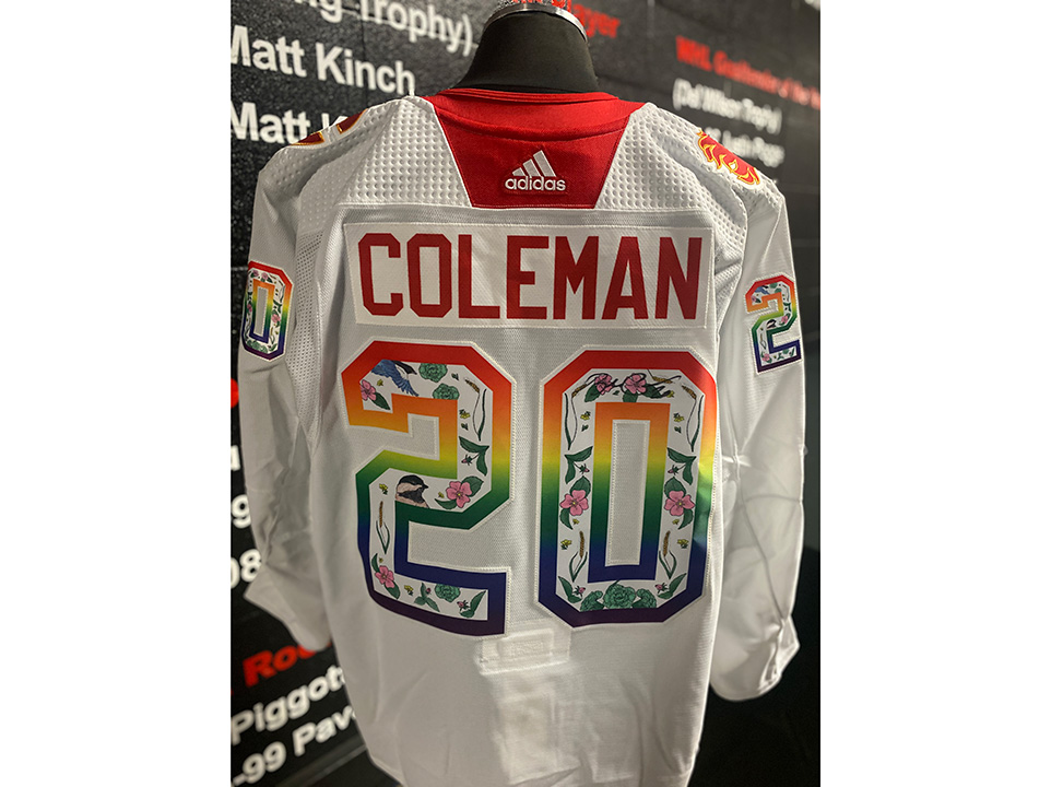 The autographed Pride Night Warm Up jerseys are authentic on-ice jerseys engineered by ADIDAS to the exact specifications of the National Hockey League. The jersey is made in Canada and the material is 100% polyester. The jersey features an authentic tie down strap and player name and number on the back and sleeves. The logos and pattern inside the numbers were designed by a local artist from the LGBTQ2+ community. The pattern inside the Flames logo and player numbers has incorporated flora and fauna from the Alberta prairies and foothills, as well as some queer-coded florals (green carnations, lilacs...) and arranged them all in a soft and inviting pattern, loosely based on the same colour pattern as the pride flag (with the white, pink, blue, brown and black chevron).