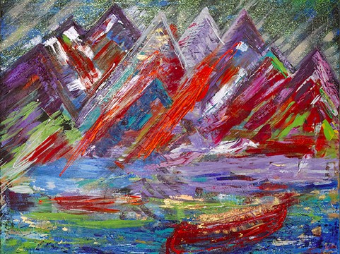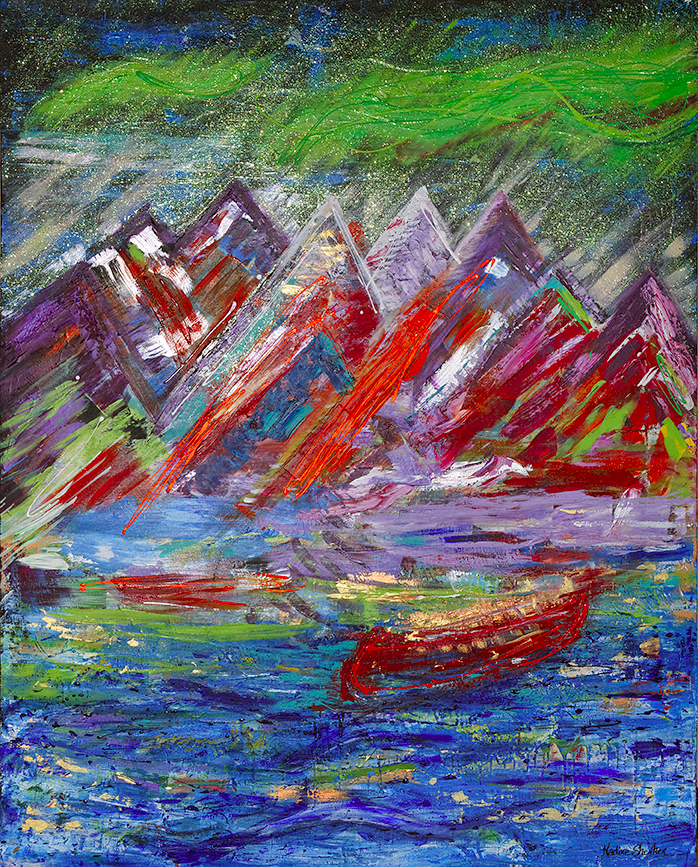 The great northern lights known as the aurora borealis are represented here shining over the Rocky Mountains. This phenomena caused by a magnetic field creates a spectacular vision of lights dancing in the sky for people here on earth to see. The magnitude of the mountains provides strength. Acrylic on canvas 51.5" x 64.5" x 2"
