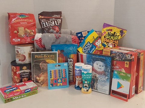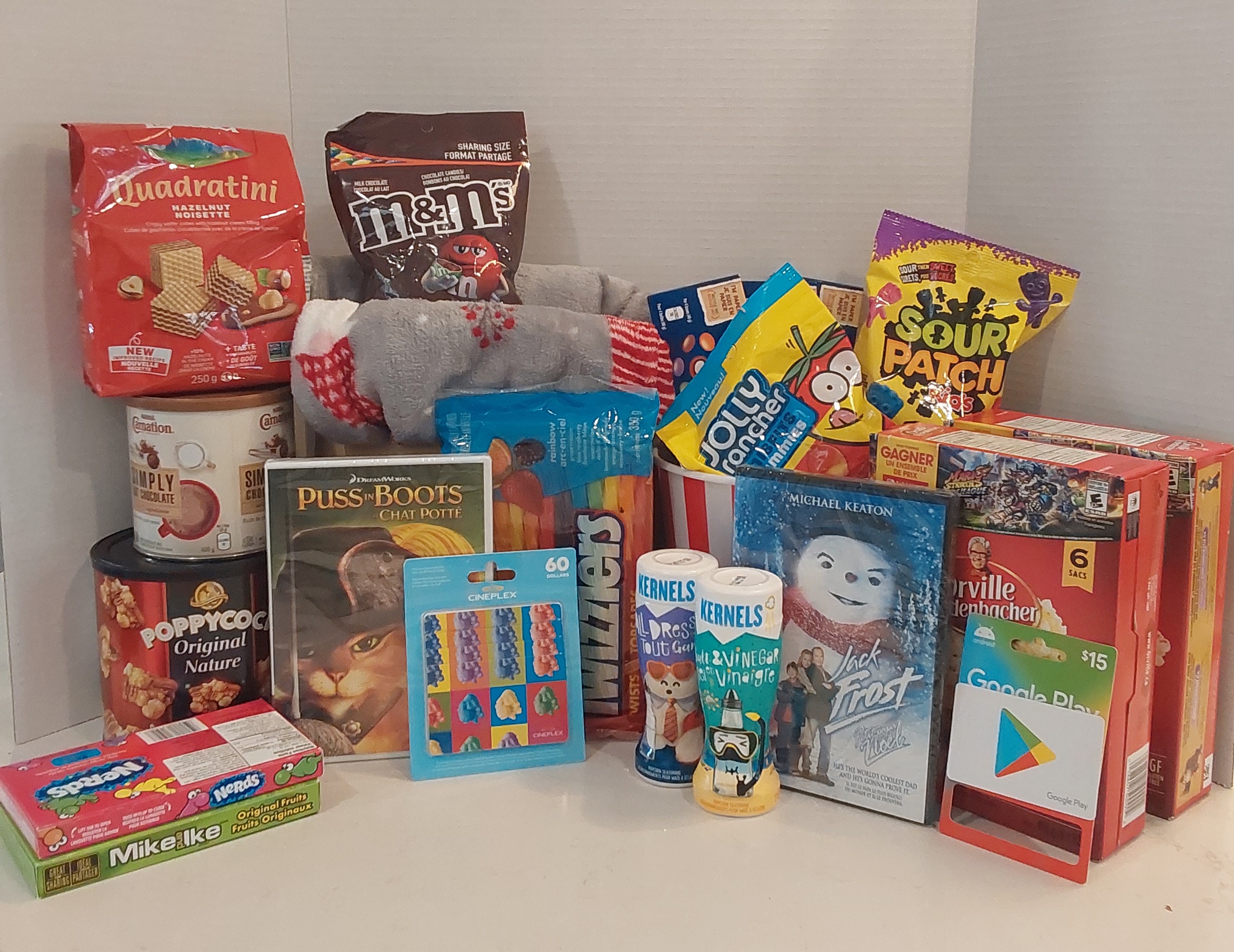 Do you LOVE movie night? If you do this basket is for you. Included in this basket is $60 in cineplex gift cards, $15 google play, blanket, popcorn, popcorn holders, Kernels popcorn seasoning, DVD's and Candies. The contents of this basket were generously donated by families from one of our grade three classes.