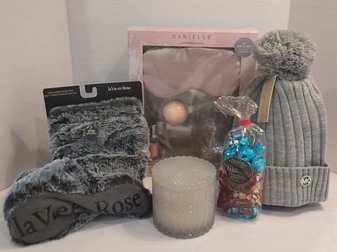 This cozy home basket basket includes some self care essentials, a Michael Kors toque. heatable slippers, candles and chocolates. The contents of this basket were generously donated by families from one of our grade six classes.