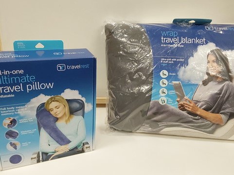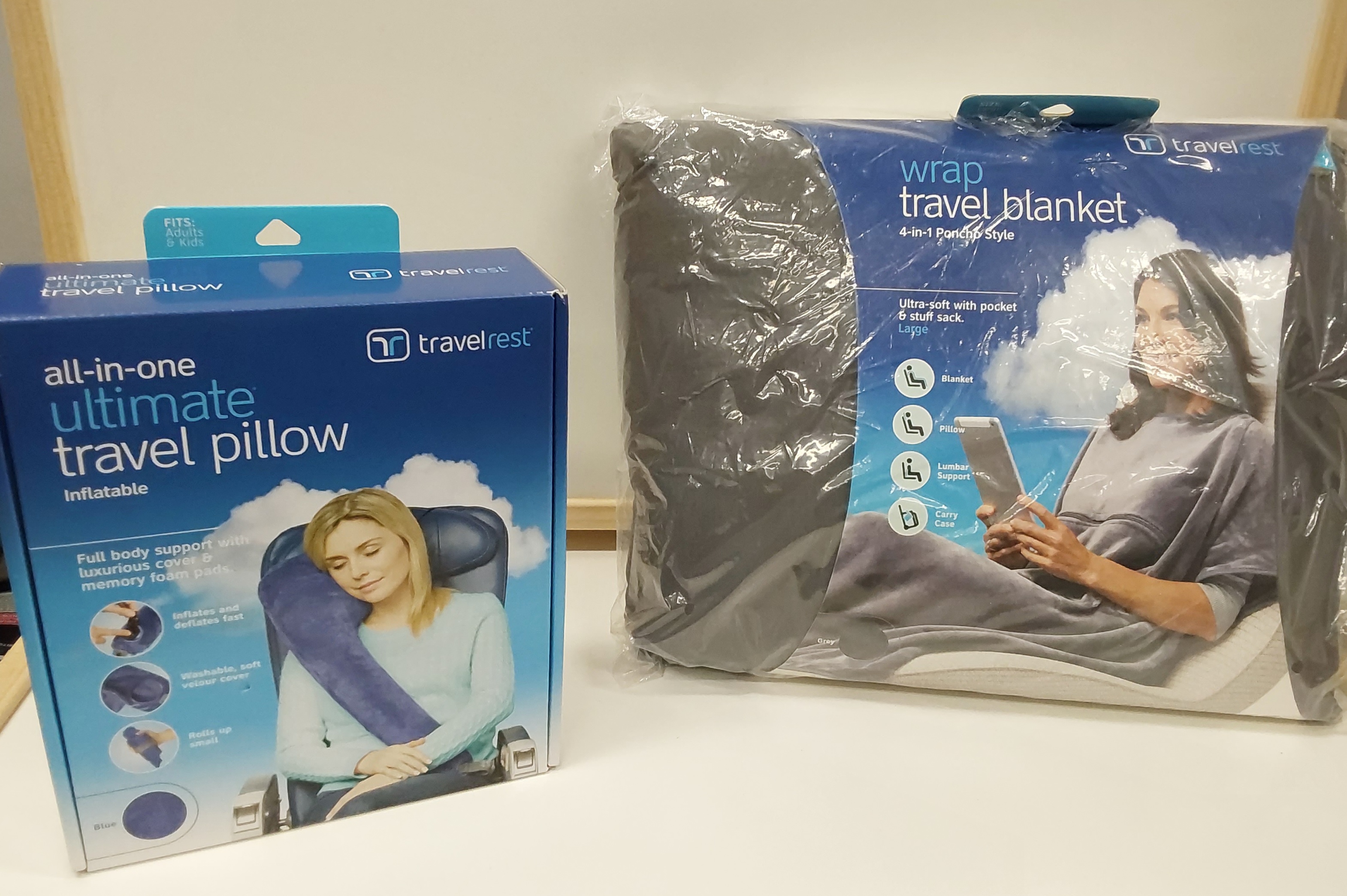 Get this traveler's comfort essentials kit to make those long and or short flight more enjoyable. This pack includes the following two items from Travel Rest; the Wrap travel blanket which is ultra-soft, has pockets and a stuff sack, and the all-in-one ultimate travel pillow which offers full body support with luxurious cover & memory foam pads.