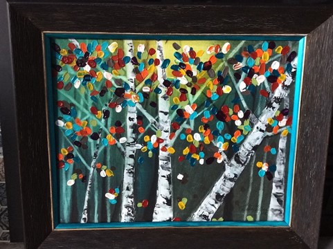 A whimsicle painting of an autumn forest. You can see the sun peeking through the trees in a difused light. I gave the trees shades of joy. Acrylic on canvas 16" x 20" x 3/4"