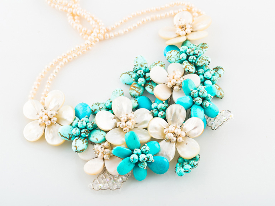 18" Botanical delight in turquoise, crystal and glass. Each necklace is hand made using twisted wire.