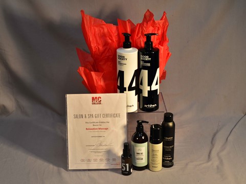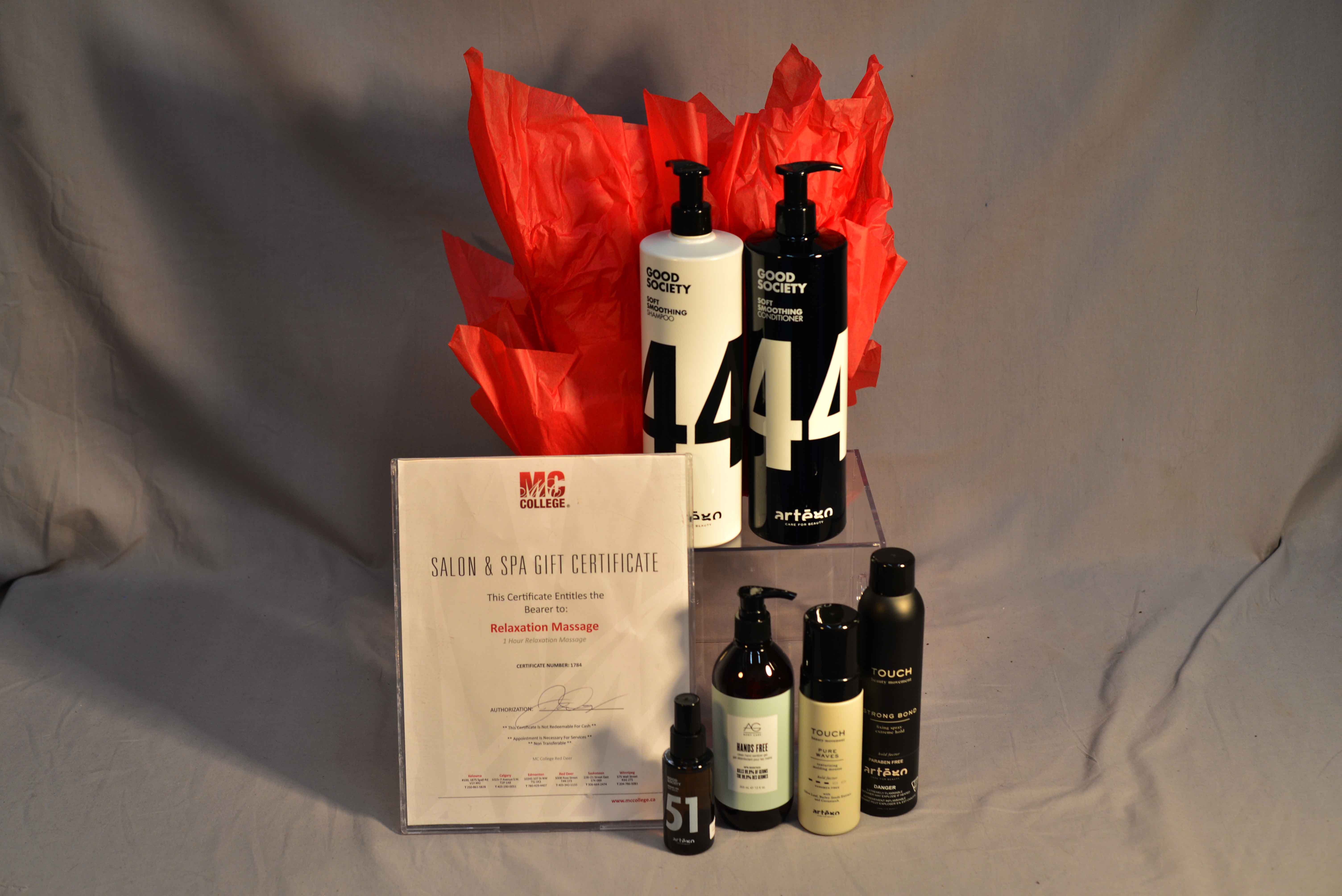 This package includes : Good Society soft smoothing shampoo and conditioner 1L, Good Society argan oil serum, Touch Strong Bonds, Touch Pure Waves, AG Hair hands free hand sanitizer and a gift certificate for a relaxation massage at Marvel College's Red Deer Campus.