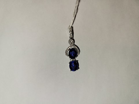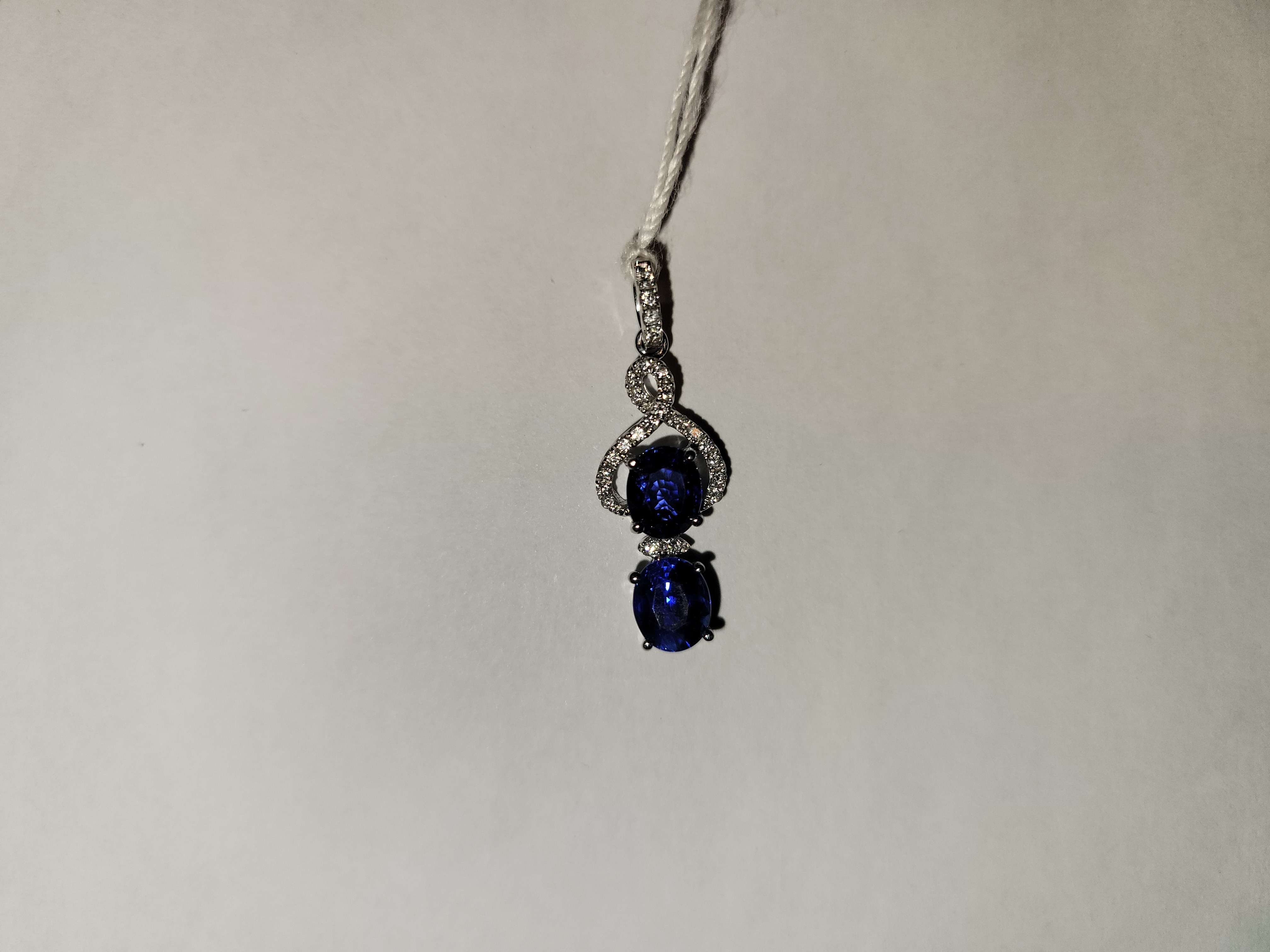 Stamped 18KT white gold pendant, set with 2 oval shaped Blue Sapphires and 26 round brilliant cut diamonds.