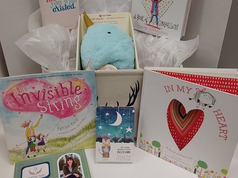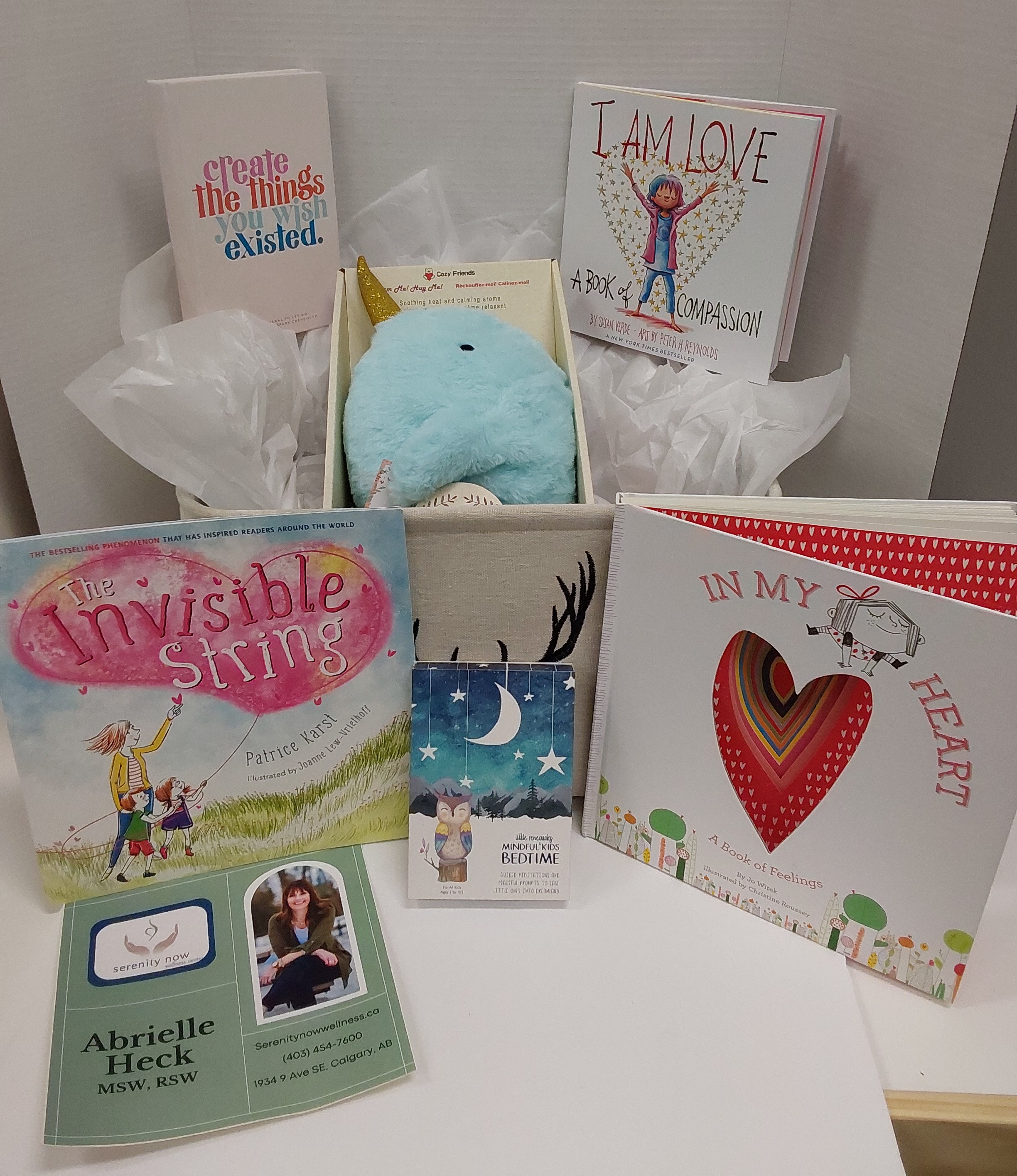 Fabulous Feelings Gift Basket from Serenity Now Wellness Centre. This baskets includes a copy of both the “I am Love” book, “The Invisible String” book, “In My Heart” book, a Gratitude Journal, Mindful Bedtime Cards, amd Heat & Aromatherapy Stuffy great for those cold nights and or to help off those winter blues.