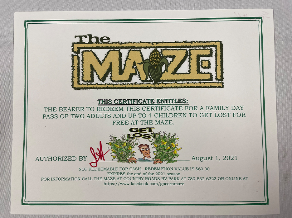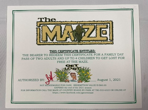 Certificate for one family day pass to the Grande Prairie Corn Maze. (Up to 2 adults and 4 children.)