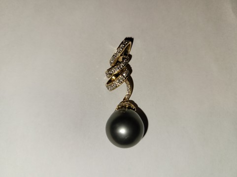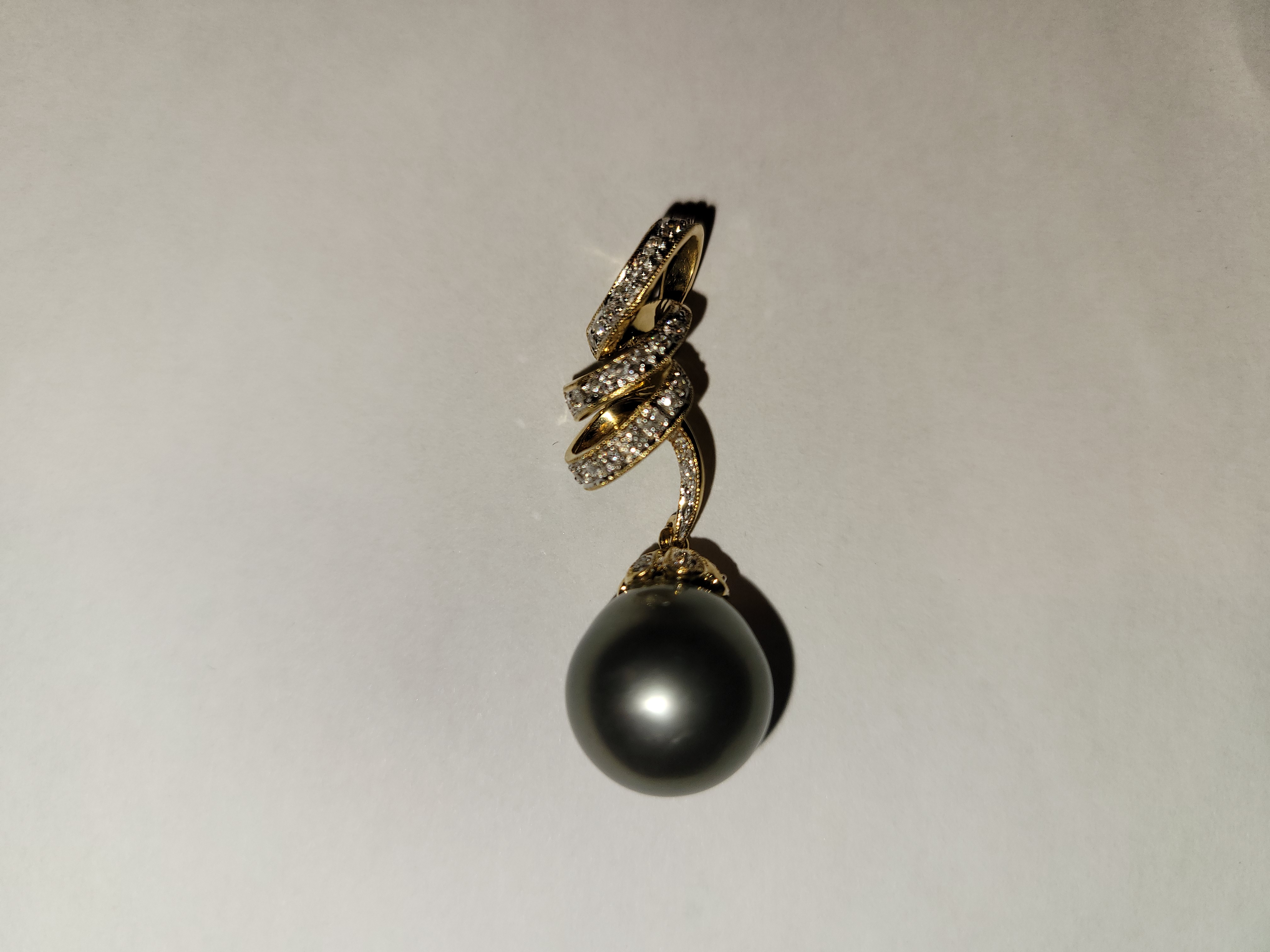 18KT yellow gold with 28 set round brilliant cut diamonds, with one black Tahitian pearl