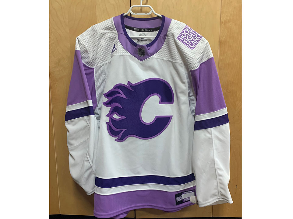 The autographed white and purple Hockey Fights Cancer themed practice jerseys are authentic on-ice jerseys engineered by ADIDAS to the exact specifications of the National Hockey League. The jersey is made in Canada and the material is made with recycled materials (100% polyester). The jersey features the Flames logo in two tone purple on the front and purple accents on both sleeves as well as the bottom trim and a tonal Hockey Fights Cancer patch on the left shoulder and a “I Fight For” patch on the bottom left front hem. It also features an authentic tie down strap and player name and number on the back. This autographed jersey is exclusive to this auction only.