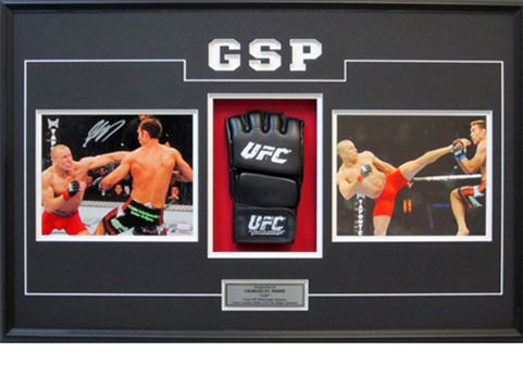 Two GSP signed glossy photos framed with one UFC fight gloves and plate in a shadow box frame with "GSP" carved into the black suede mattes. Comes with Certificate of Authenticity.