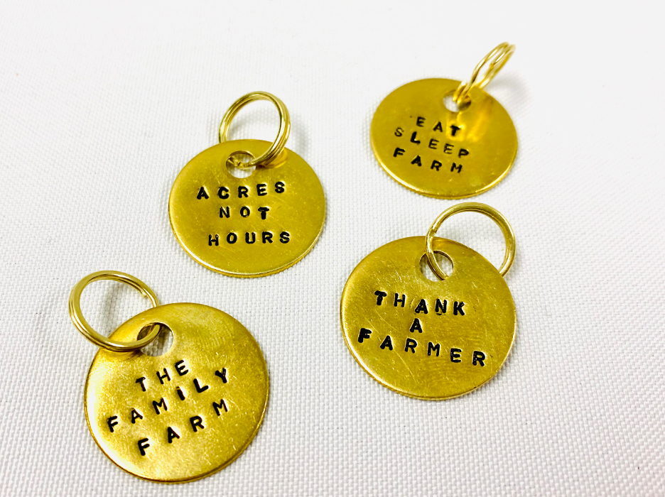 Set of 4 - Brass Stamped Keychain Tags. Includes 'Eat Sleep Farm' + 'Acres Not Hours' + 'Thank A Farmer' + 'The Family Farm'