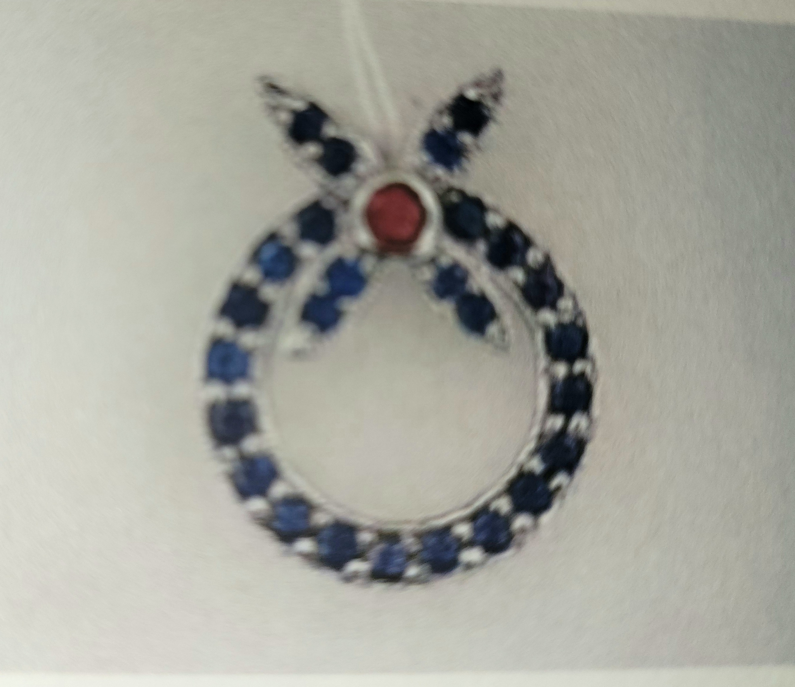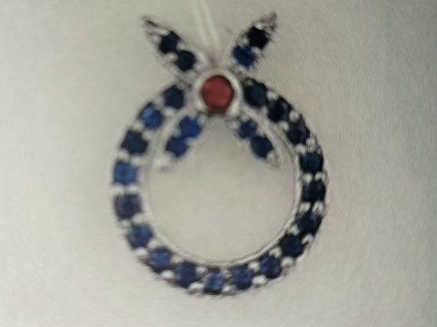 14KT white gold pendant with one pink sapphire and 26 blue sapphires