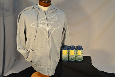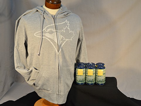 Enjoy this Medium grey zip up BlueJays hoodie paired with a six pack of the Kinabik Pilsner from Snake Lake Brewing Company. Early Settlers knew Sylvan Lake as Snake Lake, taken from the Cree name "Kinabik"- this immensely quaffable, with a snappy noble hop character and crisp finish will have you cheering through all 9 innings.